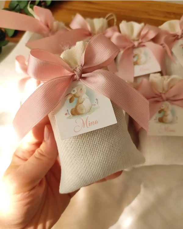 Chaque modèle est soigneusement décoré (ruban, étiquette personnalisée avec prénom ou date, illustrations douces comme un lapin ou un ourson), ce qui en fait un cadeau unique et mémorable pour vos invités.