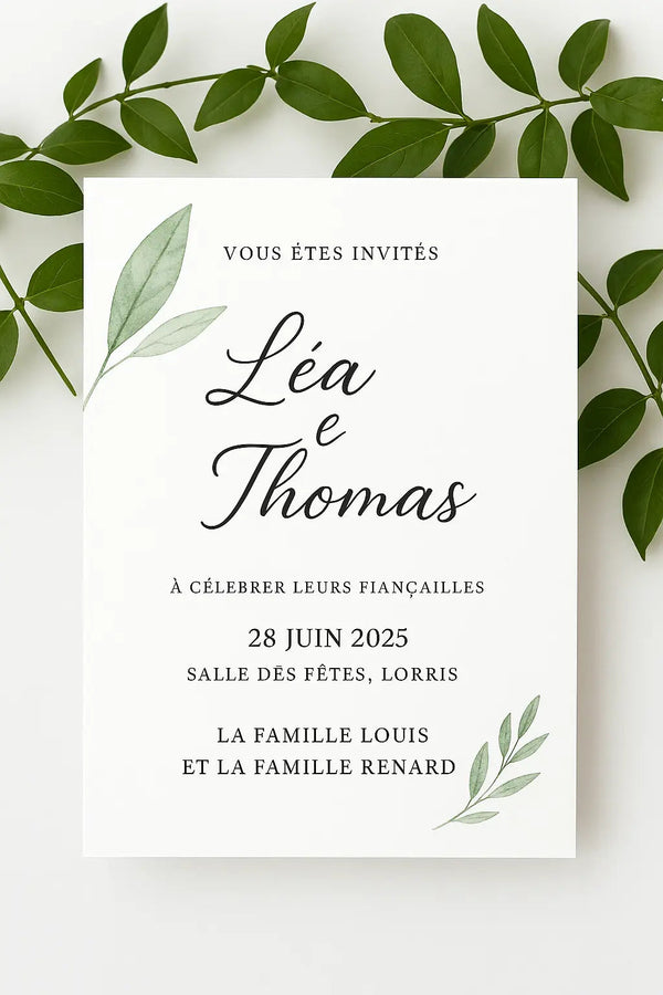 Carton d’invitation de fiançailles élégant – Modèle feuillage vert | Invitation personnalisée chic et naturelle