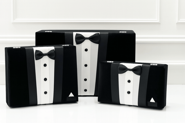 Notre coffret trousseau en forme de smoking noir et blanc allie élégance et modernité. Avec son design unique rappelant la tenue du marié, il se distingue comme une pièce chic et symbolique.