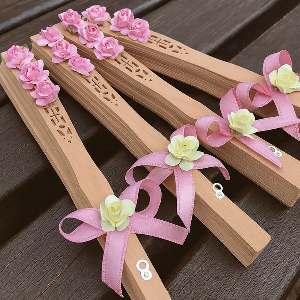 Découvrez un éventail raffiné en bois naturel, orné de fleurs délicates et de rubans satinés. Un cadeau original et élégant pour vos invités de mariage ou tout autre événement.